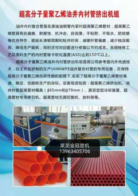 莱芜金冠塑料机械有限公司是专业从事超高分子量聚乙烯挤出设备研发、设计、生产的企业。公司主导产品有:超高分子量聚乙烯管材挤出机模具,超高分子量聚乙烯油井内衬管挤出设备,抽油杆包覆耐磨防腐超高分子挤出机组,超高分子量聚乙烯异型材、棒材、片材、板材挤出机及模具。具体产品包括:耐磨超高分子量聚乙烯管道(∮20-∮1200mm)挤出机、模具及其管材翻边机、三通弯头等辅助设备;双抗(防静电抗阻燃)超高分子量聚乙烯管材挤出设备;超高分子油井复合衬管挤出设备及其拉拔缩径机;油井杆包覆超高分子挤出机组;耐磨超高托辊管材(∮89-159mm)挤出机、模具及其辅助设备;超高分子复合管材挤出设备。联系电话13963405706。金冠塑机-----超高分子量聚乙烯管材挤出机及模具制造专家;铸“金牌塑机”是金冠人不懈的追求。